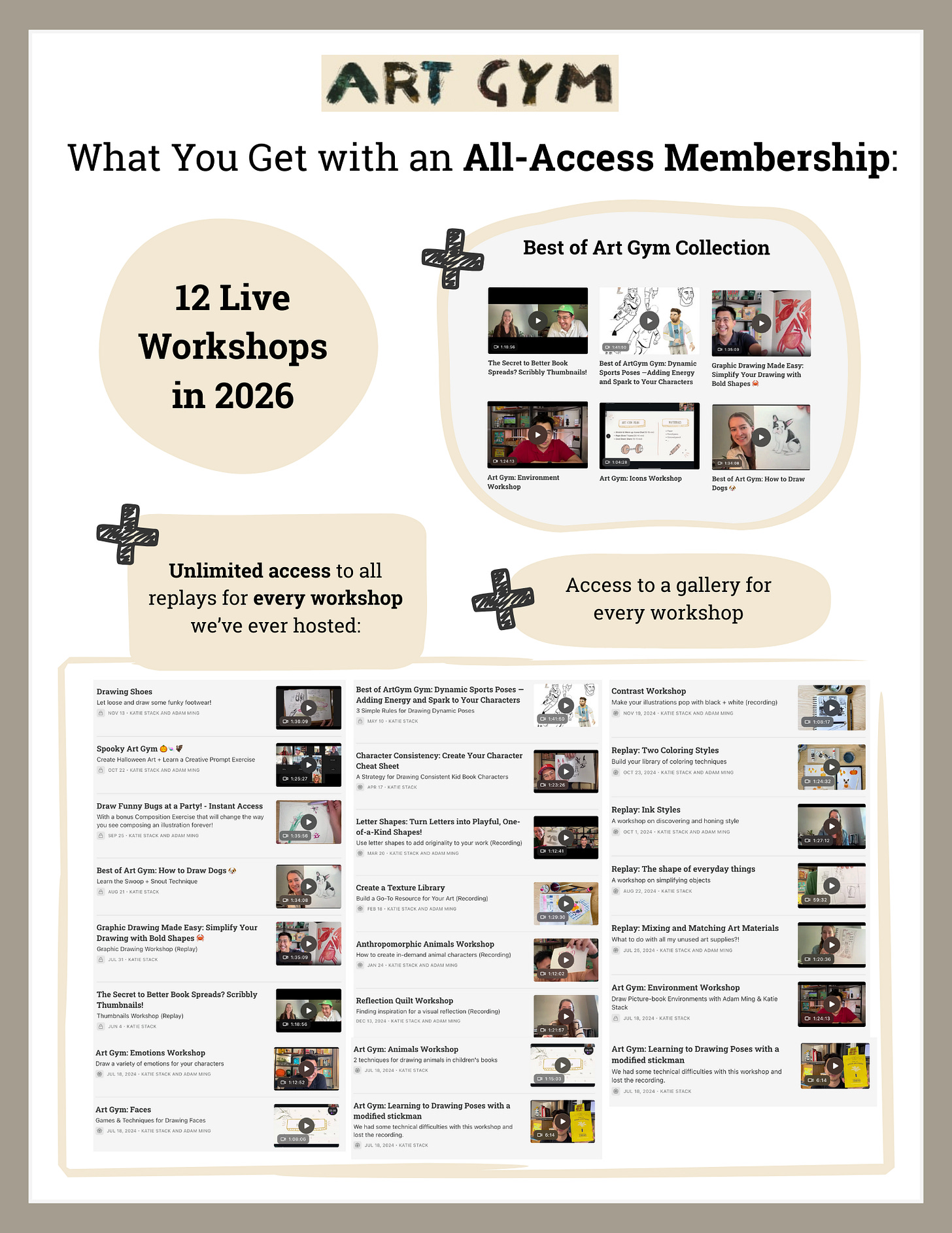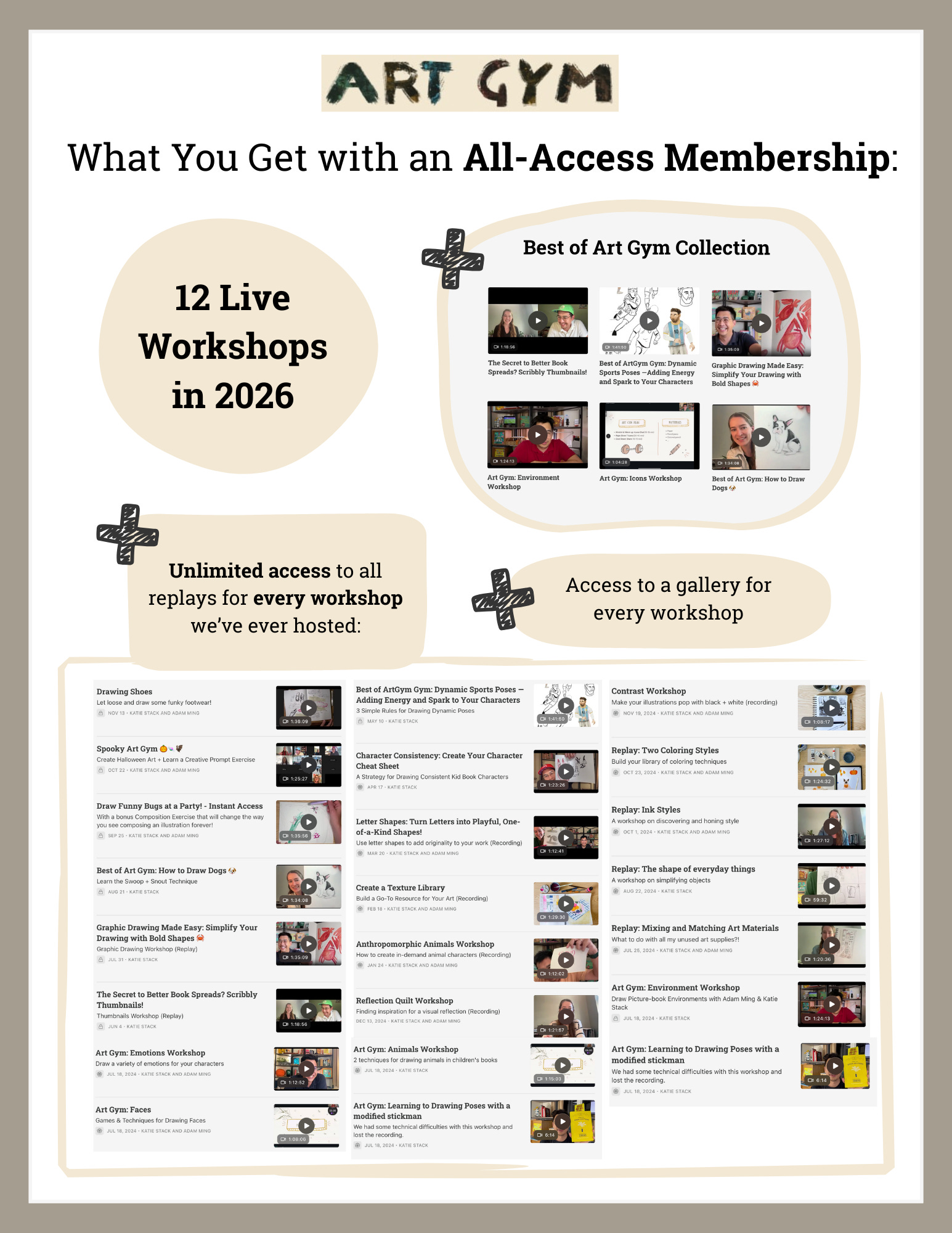 The entire Library of Art Gym Workshops for the duration of your membership. 42 hours of video.