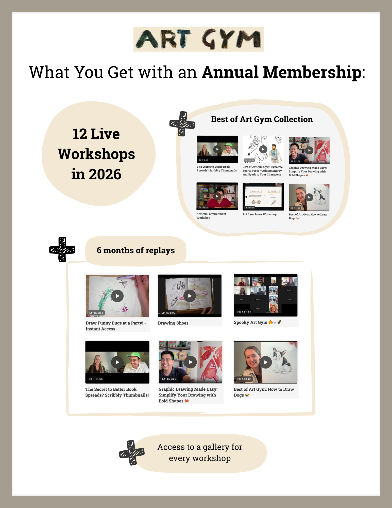 With All Access Memberships you gain access to 12 Months of Live Art Gym Workshops, where you can ask questions, share your work, and draw with other Arthletes in real time.