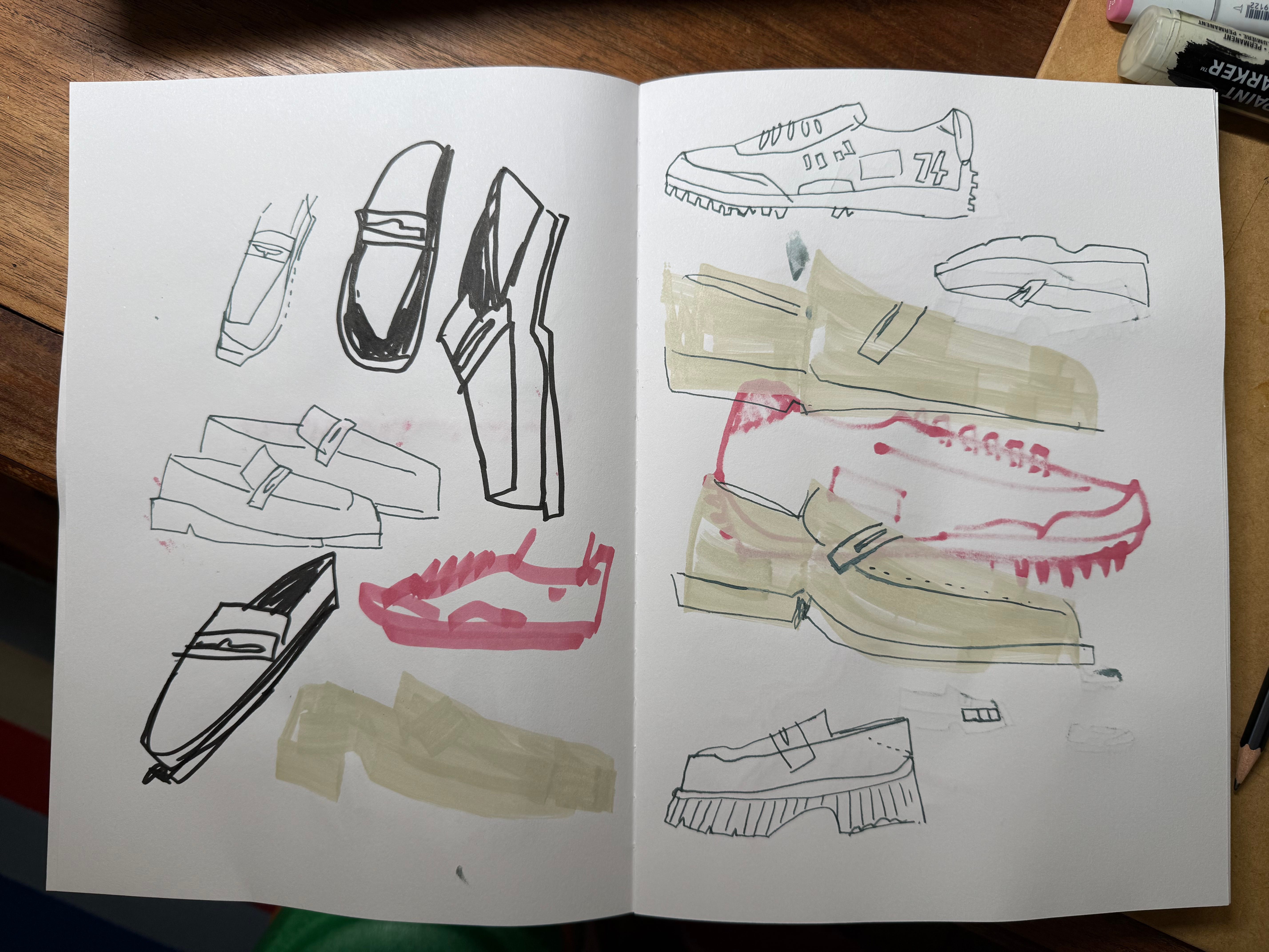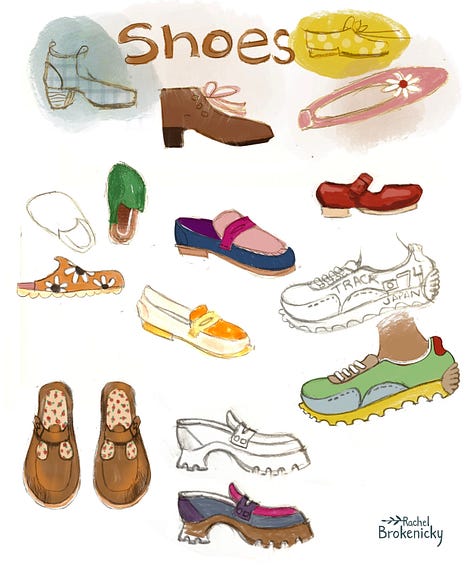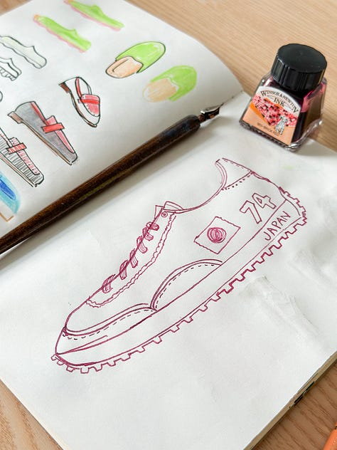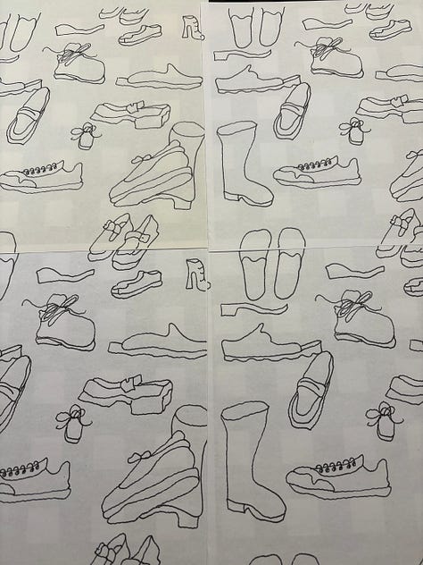 You will begin by drawing various styles of shoes, and the focus will be to have fun while noticing things about shoes. Some call this part research, we call it gathering, or building a visual vocabulary.