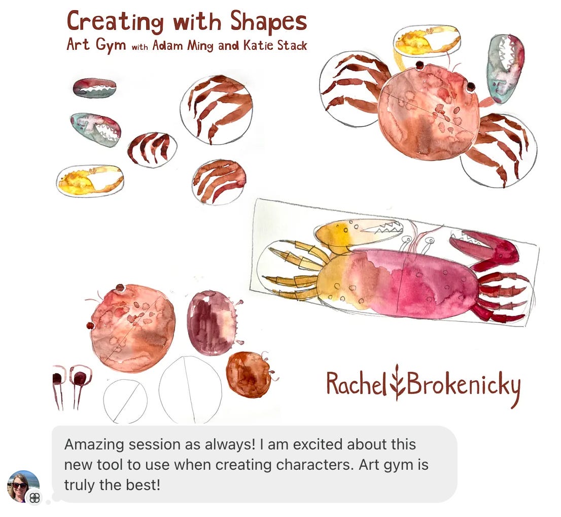 In this one hour workshop, Adam Ming and Katie Stack will lead you through a series of exercises to draw in a graphic style. You will begin by intentionally drawing various shapes that will later become the building blocks of your artwork. By the end, you will have tons of pages of shapes that can be used in your future work, and most excitingly, you will have a completed piece of art featuring a crab! 🦀 (Why a crab? Well aside from being very fun to draw, crabs are made up of lots of shapes that make them the perfect subject for this exercise!)